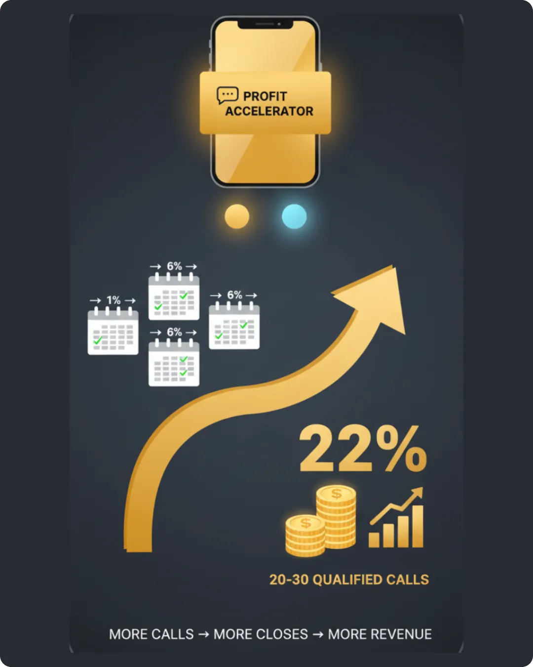 Let’s talk numbers. Traditional outreach might scrape together 1% call bookings. Human reps can push it to 6%. Profit Accelerator consistently delivers up to 22% (from the exact same leads).